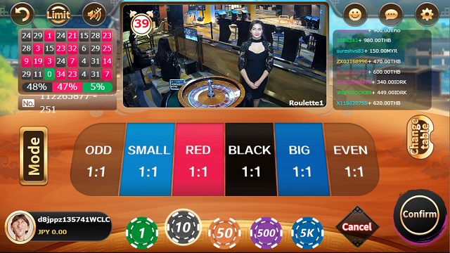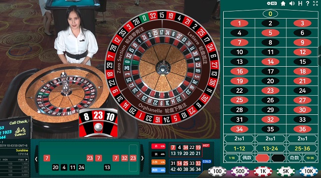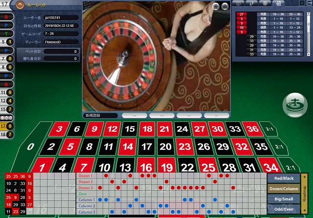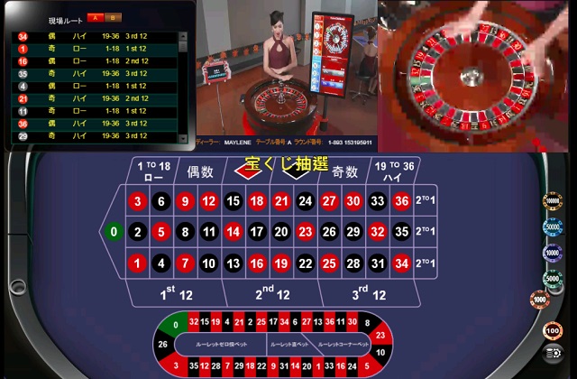 ロータスライブのルーレットの特徴は赤黒の結果を表示している罫線です。通常ルーレットで使用する罫線では単に赤黒の色だけを使用しますが、ロータスルーレットでは色と一緒に出目の番号もわかるような表記になっています。アウトサイドベットとストレートベットを組み合わせて賭ける時の参考になるので、地味に使い勝手のいいテーブルです。