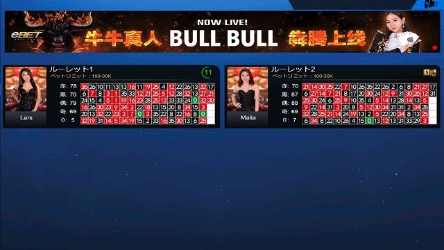 EBETライブは近年急成長しているアジア系ゲーミングプロバイダーです。ルーレットでは2つのテーブルで遊ぶことができ、他にも「バカラ」「シックボー」「ドラゴンタイガー」「ブルブル」で遊ぶことができます。