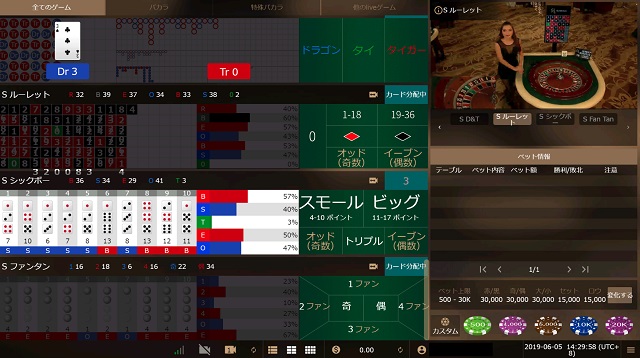 ロータスライブのルーレットは1つしかありません。ルーレット以外では「バカラ」「シックボー」「ドラゴンタイガー」「ポーカー」「レッド&ホワイト」で遊ぶことができます。