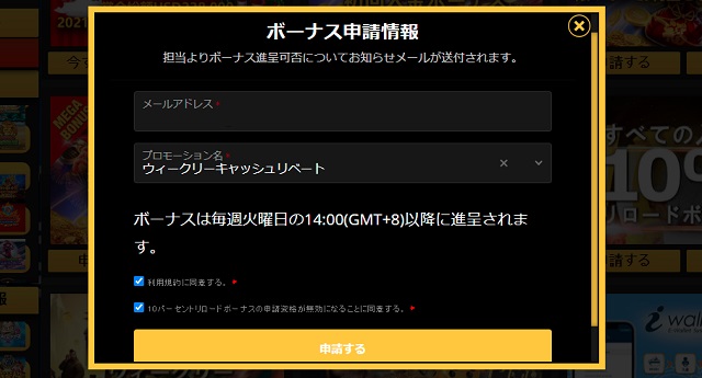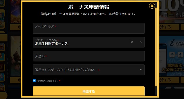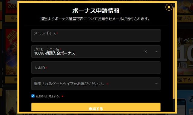 初回入金から24時間以内にプロモーションページにある初回入金ボーナスの「申請」をクリックしてください。