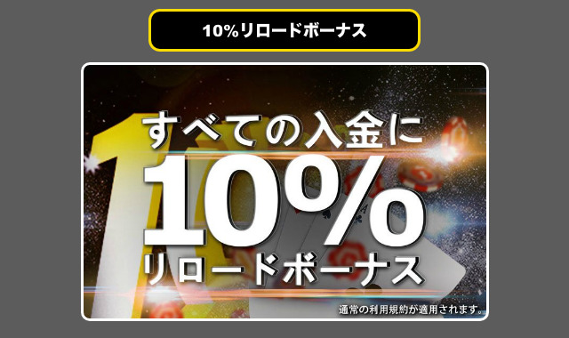 | 10%リロードボーナス | $50 | スロット:30倍 ライブ・テーブル:9倍 | 1ヵ月間 |