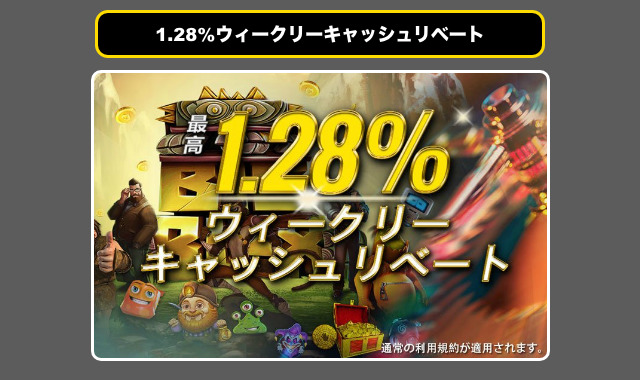 | 1.28%ウィークリーキャッシュリベート | $9,000 | 1倍 | 1ヵ月間 |