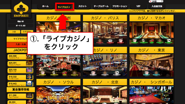 エンパイアカジノのライブカジノでポーカーが遊べるのはカジノパリスのみになります、下記のように「ライブカジノ」をクリックすればルーム一覧ページへ飛びます。