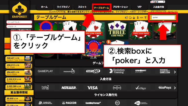 エンパイアカジノのテーブルゲームで遊ぶには、上記のように「テーブルゲーム」をクリックして「Poker」で検索してください。