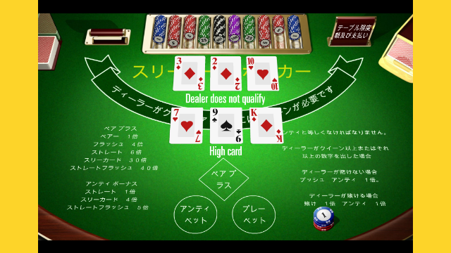 通常のポーカーと違い、3枚のカードを使って役を揃えていきます。5枚のカードで役を作らないのでフラッシュは通常のポーカーよりも揃いやすいです。