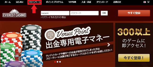 まずは、エベレストカジノ公式サイトにアクセスします。