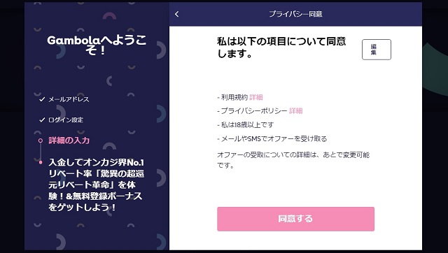 利用規約を確認したら、「同意する」をクリック。これでギャンボラの登録手続きは完了です。