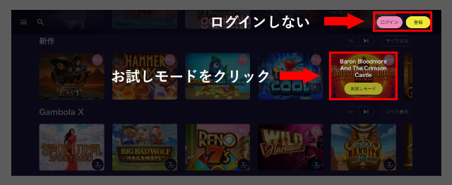 ギャンボラの一部ゲームは無料でプレイ可能です。ギャンボラ公式サイトにアクセスし、ログインしていない状態でゲームのアイコンにカーソルをあわせて「お試しモード」をクリックすれば、無料モードでゲームを起動できます。