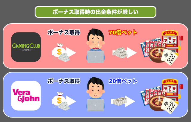 ベラジョンカジノと比べ、ボーナスの出金条件がかなり厳しく設定されていることがわかります。
