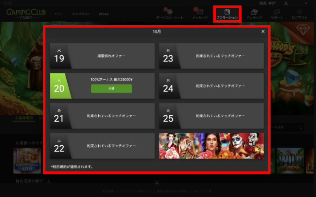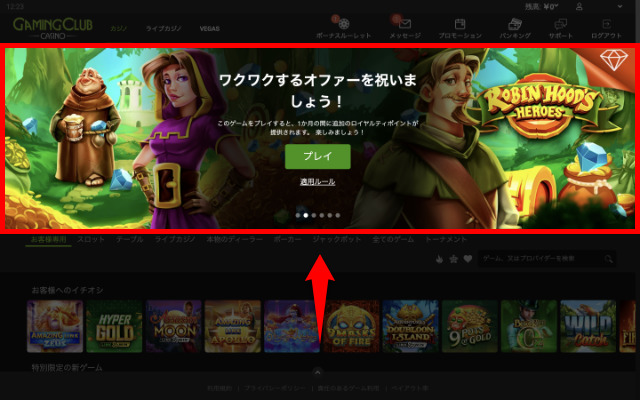 GAMING CLUB CASINOで現在開催中のプロモーションは、ログイン後に表示されるトップページのスライド式プロモーション画像で確認できます。