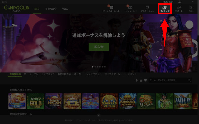 まずはGAMING CLUB CASINOにログインし、画面右上の「バンキング」ボタンをクリックしてください。