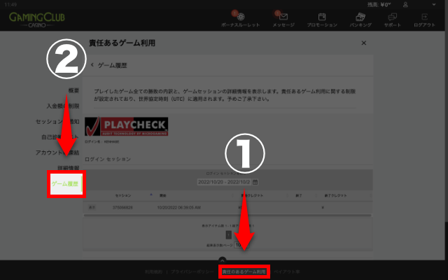 まずGAMING CLUB CASINOにログインし、画面下部の「責任のあるゲーム利用」をクリックしてください。その中の「ゲーム履歴」タブから引き出しの取り消しを確認できます。