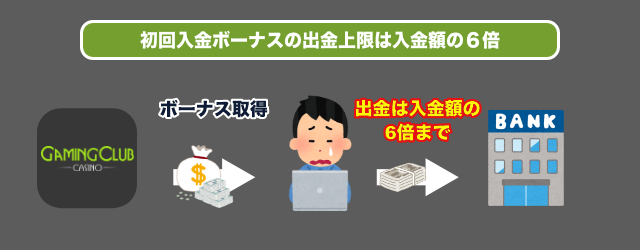 GAMING CLUB CASINOでは、初回入金ボーナスの出金上限が入金額の6倍までと決められています。