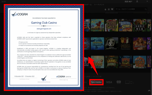 また、イギリスの独立審査機関「eCOGRA」から認証マークを授与されていて、「ゲームに公平性があるか」「支払いはきちんと迅速にされているか」「カスタマーサービスやサポートは万全か」など厳しいチェックを継続して受けながら、プレイヤーの安心・安全に努めています。