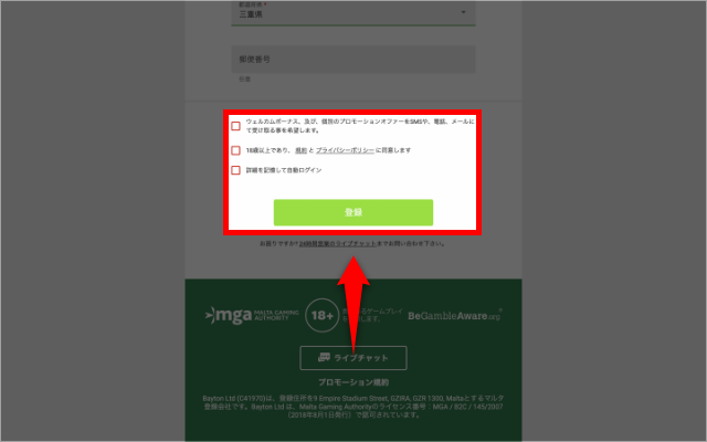 なお、ボーナスやプロモーションオファーをメールで受け取りたくない場合は、1番上のチェックボックスは空欄のままで問題ありません。自動ログインを希望する際は、1番下のチェックボックスにチェックを入れてください。