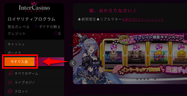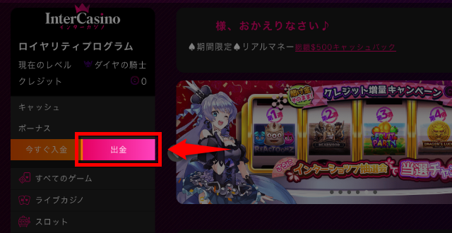 インターカジノで出金する手順をスクショを用いて解説していきます。