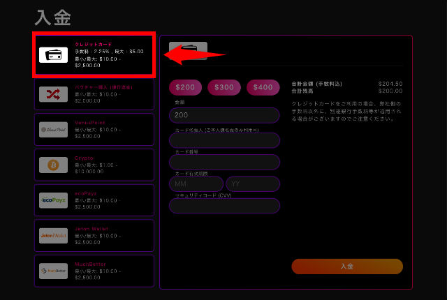 | 入金方法 | クレジットカード(VISA / MasterCard / JCB / American Express) / 仮想通貨 / MuchBetter / ecoPayz / Vegawallet / Jeton / 銀行送金 |
