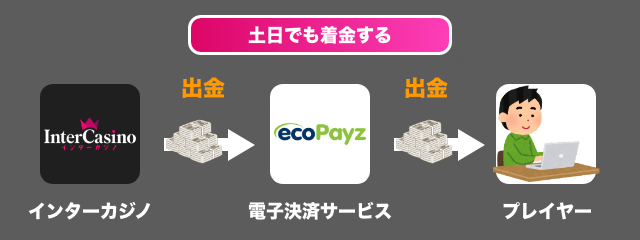 インターカジノの公開情報によると、エコペイズなど電子マネー決済による出金時間は24時間以内、銀行送金による出金時間は2~3営業日となっています。
