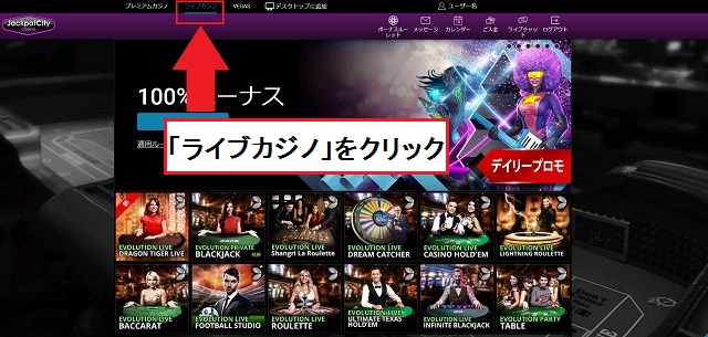 ジャックポットシティカジノのライブカジノでルーレットを遊ぶには、上部メニュー欄から「ライブカジノ」をクリックしてください。