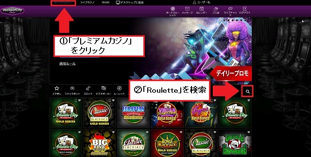 公式HPの左上にあるメニュー欄で「プレミアムカジノ」をクリックし、検索機能で「Roulette」を検索すればテーブルゲームのルーレット一覧が表示されます。