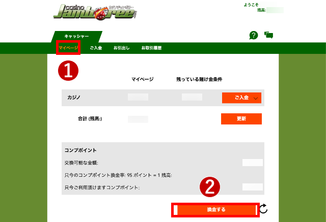 コンプポイントからキャッシュに換金したい場合は、「換金する」をクリックしましょう。換金手続きが無事処理されれば、アカウント残高が増えます。