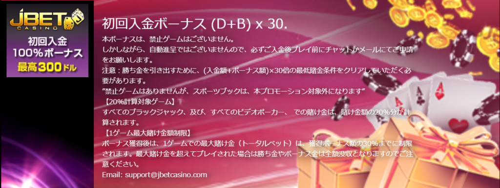 初回入金ボーナスを設けているオンラインカジノは数多く存在しますが、JBETCASINO(ジェイベットカジノ)では、初回入金ボーナスとして、30ドルもゲットすることができます。