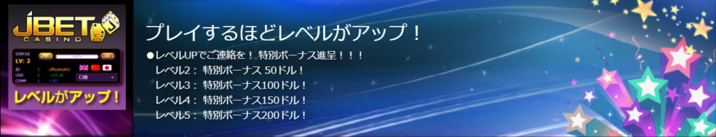 その他にもたくさんのキャンペーンやボーナスなどが日々更新されているため、様々なものがあります。 JBETCASINO(ジェイベットカジノ)では、プレイした額でレベルアップするように設定されています。