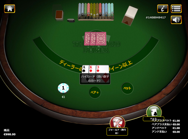 一般的にポーカーと言うと、5枚のトランプで作られた役を競いますが、このゲームでは名前の通り3枚のトランプで役を作ります。