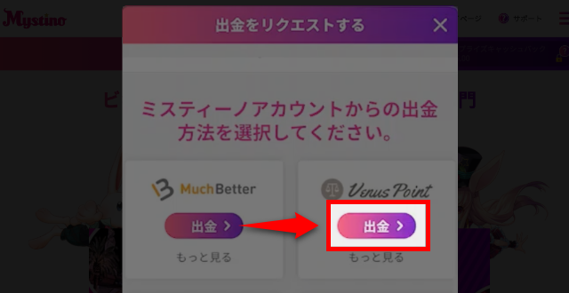 | 出金方法 | ecoPayz / VenusPoint / 銀行送金 / 仮想通貨 / MuchBetter / ベガウォレット / STICPAY / Jeton |
