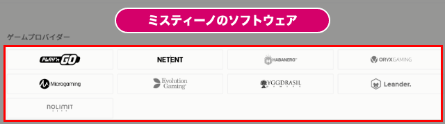 | ソフトウェア | 1x2Gaming / betsoft / BigTimeGaming / blueprint / Booming / booongo / concept / Espresso / Evoplay / EvolutionGaming / Gameart / Gamomat / Givme / Habanero / JapanTechnicalGames / kalamba / Leander / LightningBox / Microgaming / Multislot / NetEnt / NolimitCity / Onetouch / Oryx / Pariplay / PGsoft / Play’n Go / Playson / PragmaticPlay / PushGaming / RedTiger / RelaxGaming / Revolver / RTGasia / Skywind / Slingo / Slotmill / Thunderkick / Tomhorn / TriplePG / Yggdrasil / Wazdan |