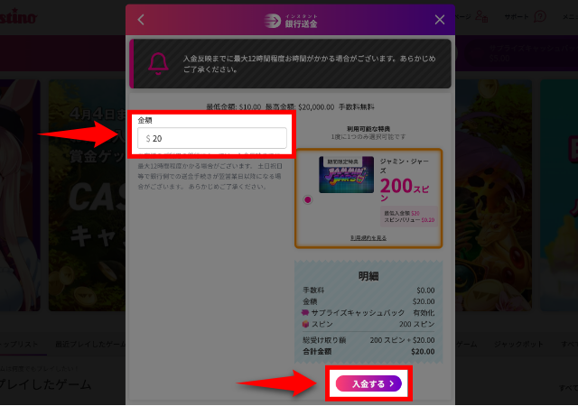 入金特典デイリースピンを獲得する際、ベット額に注意してください。1回目の入金特典デイリースピンは特に制限がありませんが、2回目以降から前回獲得した入金特典デイリースピンの最低入金額以上をベットしている必要があります。