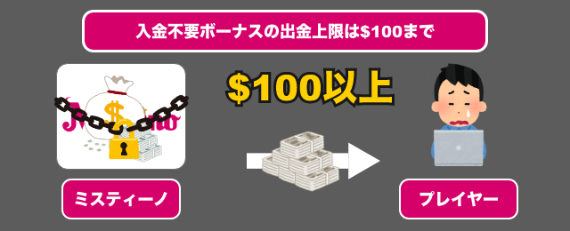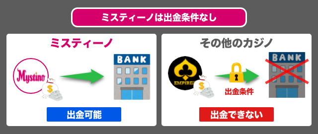 通常オンラインカジノには出金条件がありますが、ミスティーノのボーナスはどれも出金条件がないか、もしくはボーナス額1倍と超低設定です。