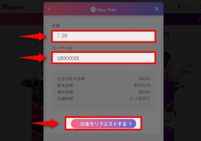 ミスティーノの出金スピードが早いかどうか確認するため、実際に出金申請してみました。