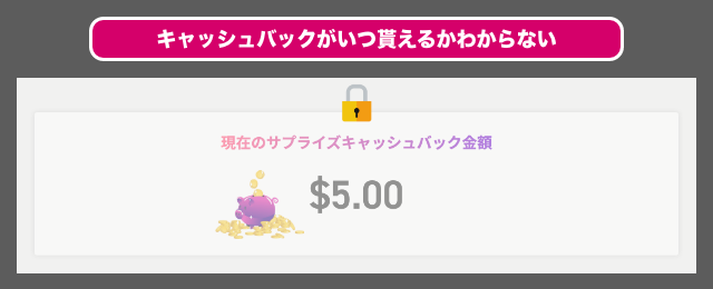 サプライズキャッシュバックとはミスティーノ独自の還元型ボーナスで、プレイ額の一部が出金条件なしのキャッシュバックとして貯まっていき、ランダムなタイミングで還元されるというものです。