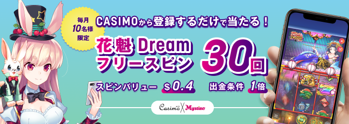 ミスティーノでは、Casimo経由で、初めて登録したユーザーを対象に、毎月抽選で10名様に「花魁Dream」フリースピン30回を提供しています。