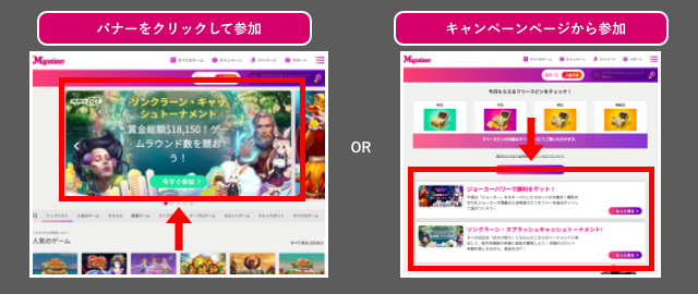 トーナメントの種類によって参加方法は異なりますが、基本的にはトップページもしくはキャンペーンページに詳細が記載されています。参加したいトーナメントが見つかれば、トップページのバナーをクリックするか、キャンペーンページから参加しましょう。