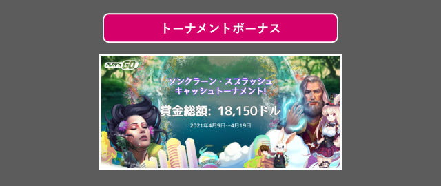 | 春が来たトーナメント with Play’n Go | Play’n Go人気ゲームでベット金額に対して最も高い勝利合計額を競う 【賞金総額】$2,000 【1位】$700 |