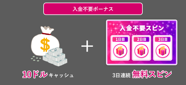 | 登録ボーナス | ・10ドル(1,500円) ・60回分フリースピン | 1倍 | 24時間~無制限 |