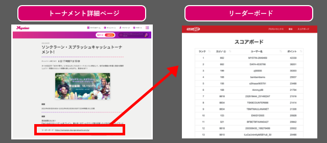 参加できたら、入賞を目指してゲームで遊ぶだけです。順位は、トーナメント詳細ページにあるリーダーボードで確認できます。