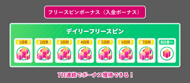 特に初回入金1日目から7日目が対象となる「入金特典デイリースピン」は超豪華!以下のようなフリースピンボーナスを入金するだけでゲットできます。