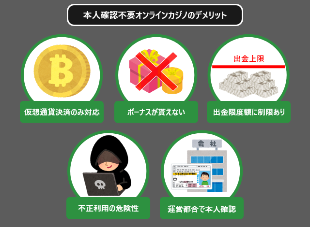続いて、本人確認不要のオンラインカジノのデメリット下記5点をみていきましょう。