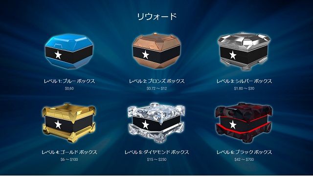リウォードボックスは全部で6種類あります。サイズが大きくなり、価値も高くなれば、リウォードも豪華になります。ボックス種類は以下の表のとおりです。