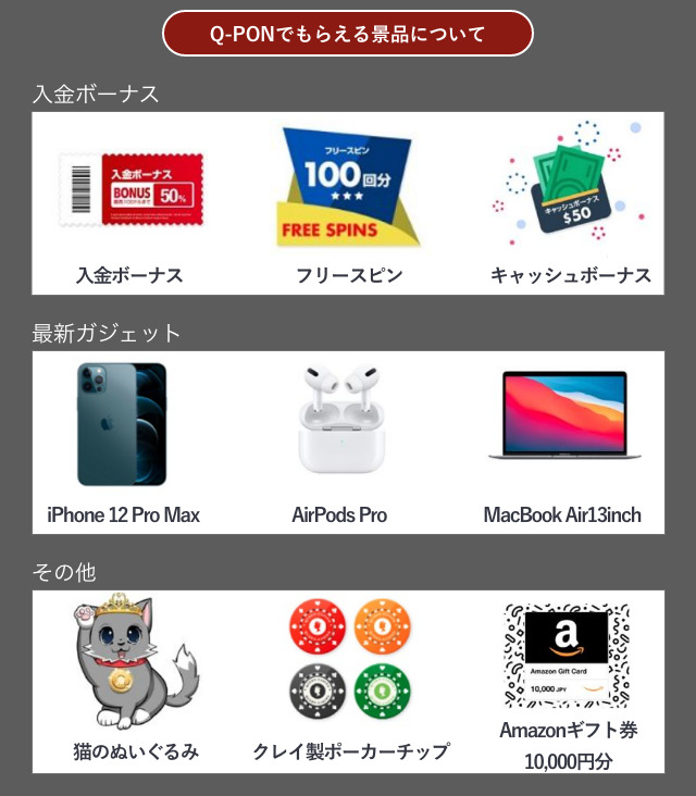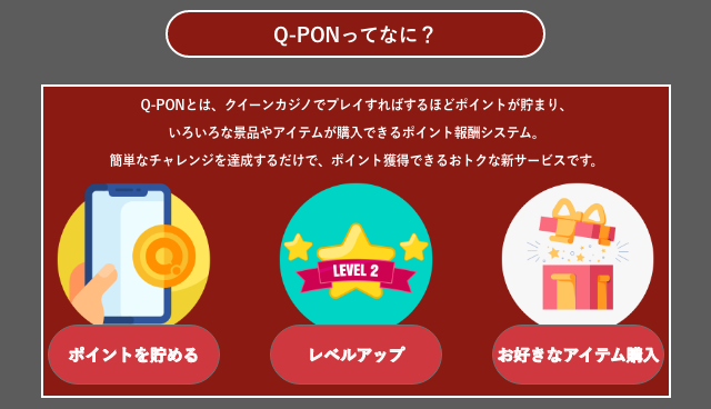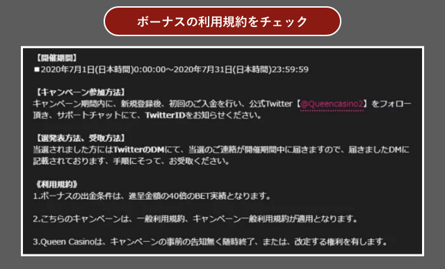 なお、イベントボーナスの内容については、都度異なるため、ボーナス取得条件や、出金条件などは、都度クイーンカジノの利用規約をお読みください。