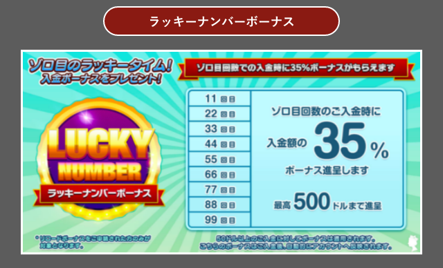 ラッキーナンバーボーナスでは、入金するタイミングが11回目、22回目、33回目など、ゾロ目の回数のタイミングに受け取ることができるボーナスです。(99回目まで)