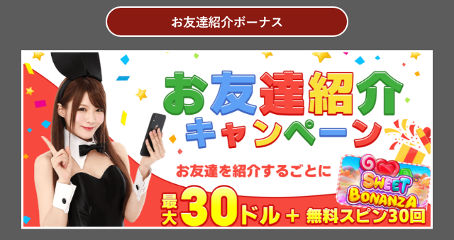 | お友達紹介ボーナス | 最大$30 + フリースピン30回 | 20~25倍 | 30日間 |