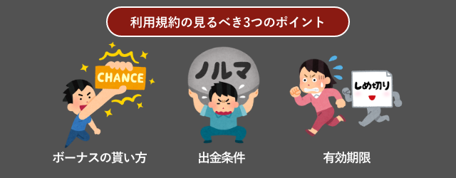 - 各種ボーナスで利用規約がことなるので利用規約の確認はその都度必要