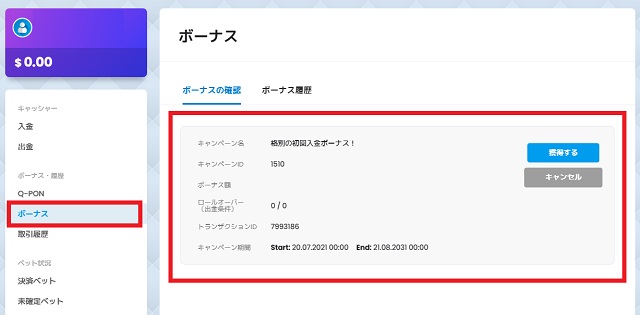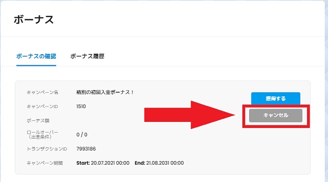 破棄したいボーナスがある場合は、ボーナスページにて「キャンセル」をクリックしてください。