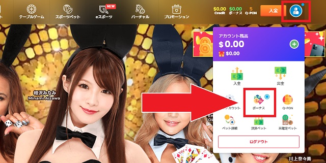 ログインページの画面右上にある人型アイコンから、メニュー「ボーナス」をクリックしてください。