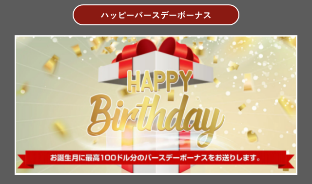 誕生日の当月から過去2か月以内の入金額に対して、10%のバースデーボーナスを付与されます。
