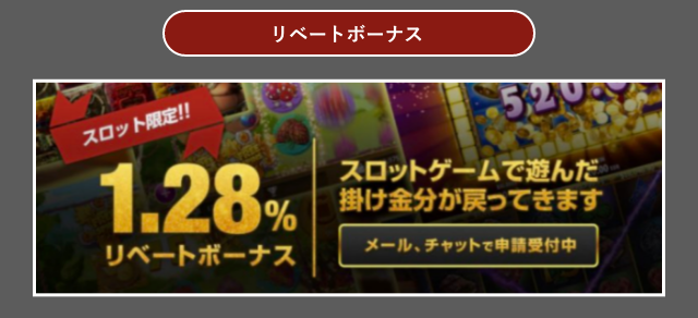 リベートボーナスとは、カジノゲームで使用した賭け金の一部が還元される出金条件1倍のボーナスのことです。